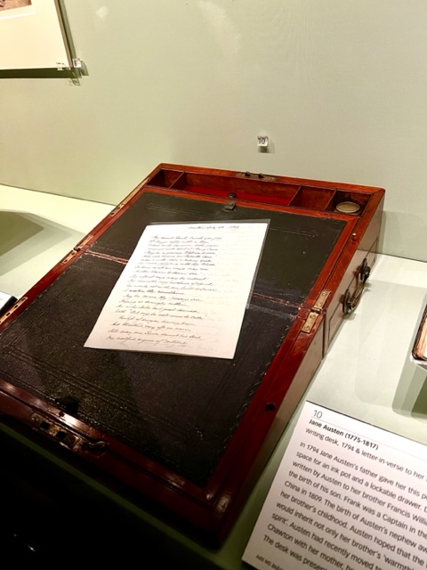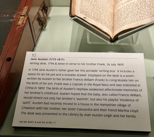 I loved seeing this writing desk in real life. Being an antipodean, viewing historical artefacts such as this is a rare treat. I had no idea when I visited the British Library that day I would see Miss Austen’s portable writing box, and it was a highlight.